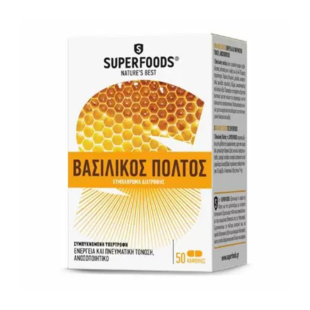 To Superfoods Βασιλικός Πολτός 50 caps, αποτελεί ένα πολυθρεπτικό συμπλήρωμα διατροφής με βασιλικό πολτό, τη μοναδική τροφή της βασίλισσας μέλισσας, πλούσια σε βιταμίνες, μέταλλα, ιχνοστοιχεία, αμινοξέα, πρωτεΐνες και λιπαρά οξέα.