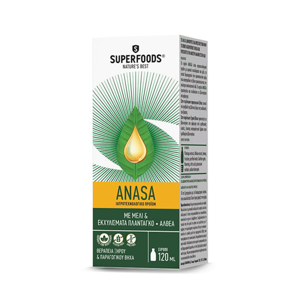 Το Superfoods Anasa είναι ένα φυτικό σιρόπι με μέλι, και εκχυλίσματα από πλαντάγκο και αλθαία για τον ερεθισμένο λαιμό και την αντιμετώπιση του ξηρού και παραγωγικού βήχα.