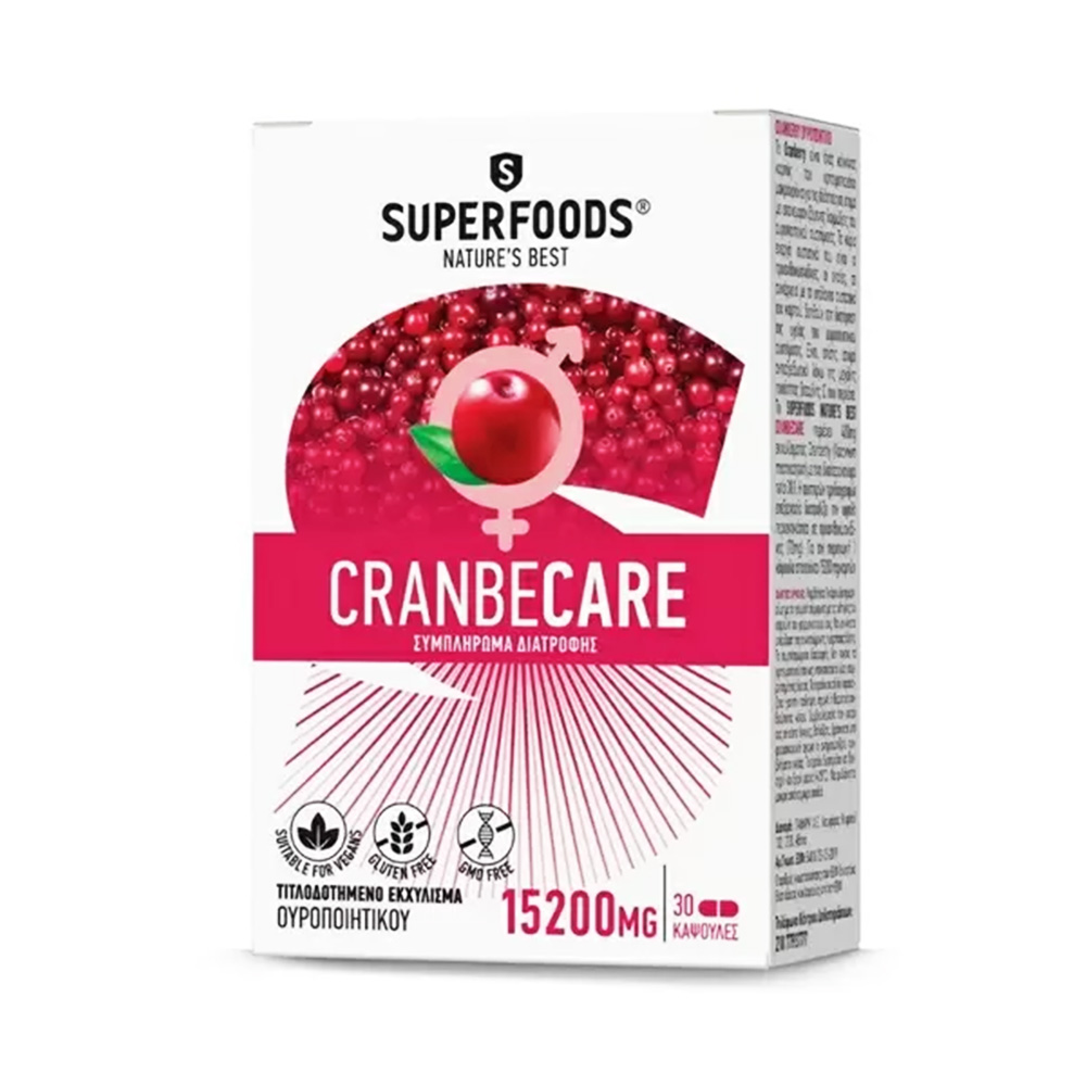 Το Superfoods Cranbecare είναι ένα συμπλήρωμα διατροφής με κράνμπερι. Περιέχει 400 mg εκχυλίσματος κράνμπερι με ισχυρή αναλογία 38:1. Για την παραγωγή μιας κάψουλας Cranbecare χρειάζονται 15200 mg καρπών. Χάρη στις υψηλές προδιαγραφές εξασφαλίζεται τιτλοδοτημένη ποσότητα 72 mg προανθοκυανιδινών.