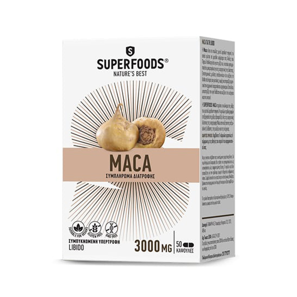 Το Superfoods Maca είναι ένα φυτικό συμπλήρωμα διατροφής που περιέχει τη ρίζα Lepidium meyenii για ενέργεια και αύξηση της ζωτικότητας.