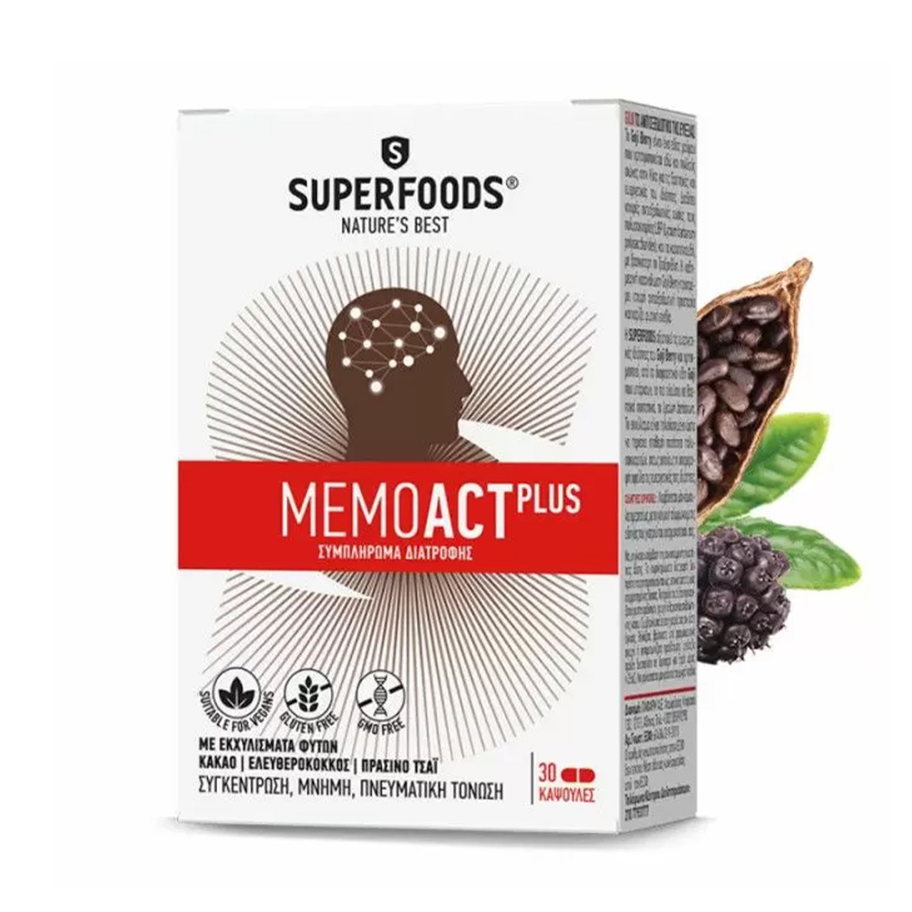 Το Superfoods MemoAct Plus είναι ένα συμπλήρωμα διατροφής με κακάο, πράσινο τσάι, συνένζυμο Q10, βιταμίνες του συμπλέγματος Β και ψευδάργυρο για την ενίσχυση της μνήμης, της συγκέντρωσης και της γνωστικής λειτουργίας. Ιδανικό για άτομα ώριμης ηλικίας ή με έντονες πνευματικές ανάγκες.