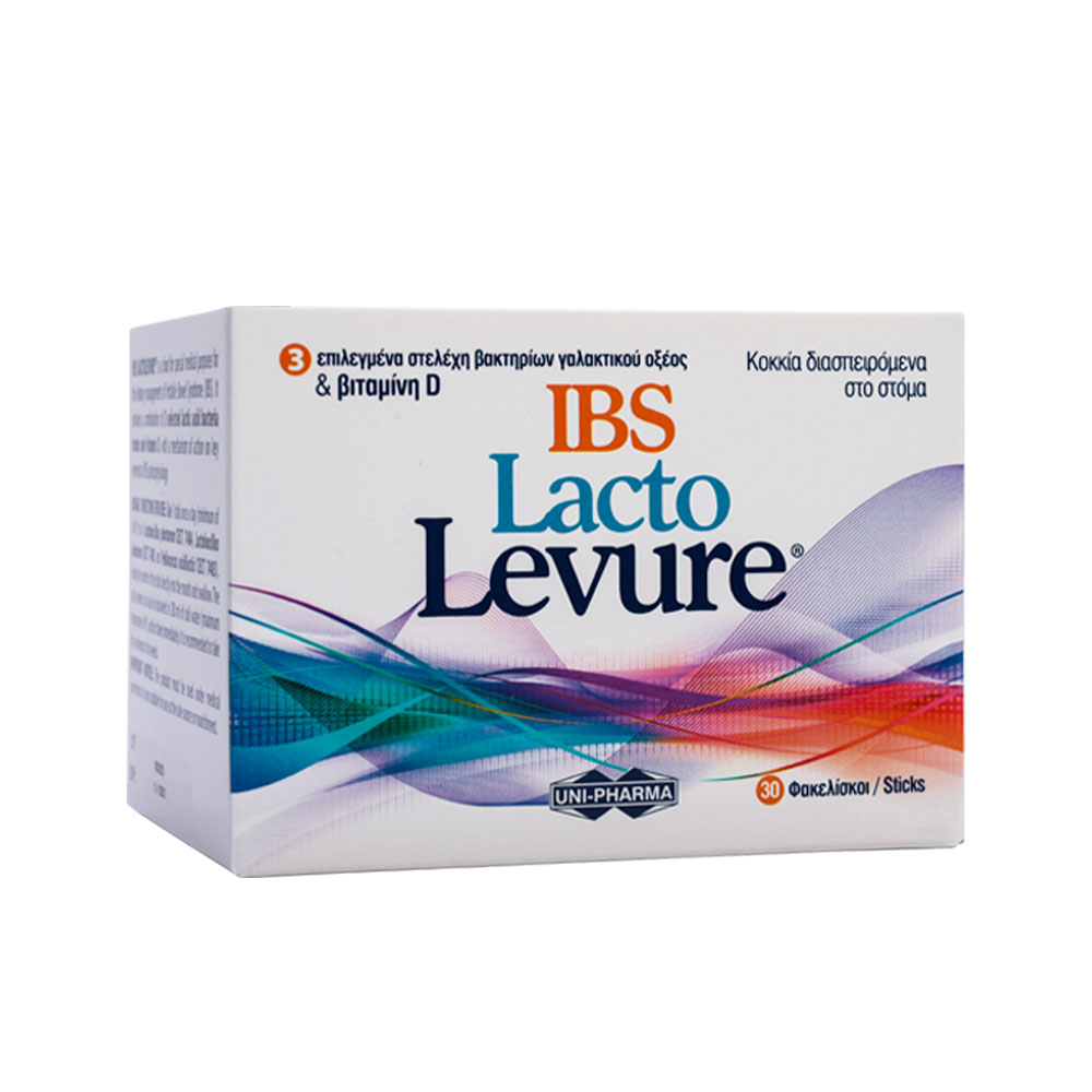 Το IBS LACTOLEVURE® είναι ένα τρόφιμο για ειδικούς ιατρικούς σκοπούς, για τη διαιτητική αγωγή ατόμων με Σύνδρομο Ευερέθιστου Εντέρου (ΣΕΕ). Περιέχει 3 επιλεγμένα στελέχη βακτηρίων γαλακτικού οξέος & βιταμίνη D, με μηχανισμό δράσης σε βασικά στοιχεία της παθοφυσιολογίας του ΣΕΕ: μείωση της εντερικής διαπερατότητας, διόρθωση της εντερικής μικροβιακής δυσβίωσης, και μείωση της φλεγμονής και της εντερικής υπερευαισθησίας. Βοηθά στη βελτίωση της ποιότητας ζωής και τη μείωση του άγχους που συνδέεται με την κατάσταση του εντέρου. Η αποτελεσματικότητά του σε ασθενείς με ΣΕΕ έχει αποδειχθεί σε κλινική μελέτη (Lorenzo-Zu?iga, V., et al. World J Gastroenterology, 2014. 20: 8709-16) και η ανεπάρκεια βιταμίνης D έχει επανειλημμένα συνδεθεί με υψηλότερο κίνδυνο εμφάνισης ΣΕΕ και μείωση της ποιότητας ζωής ασθενών με ΣΕΕ.