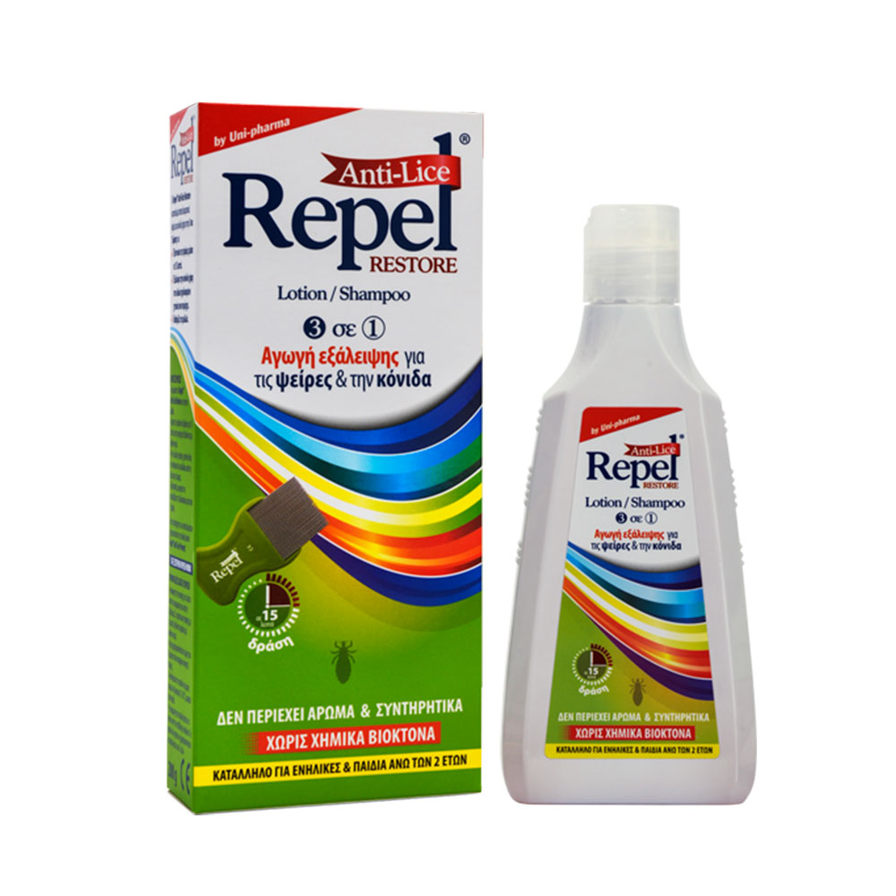 Το Repel® Anti-lice Restore αποτελείται από Lotion/Shampoo & ειδικά σχεδιασμένο χτενάκι, και απαλλάσσει αποτελεσματικά το τριχωτό της κεφαλής από τις ψείρες και τις κόνιδες.