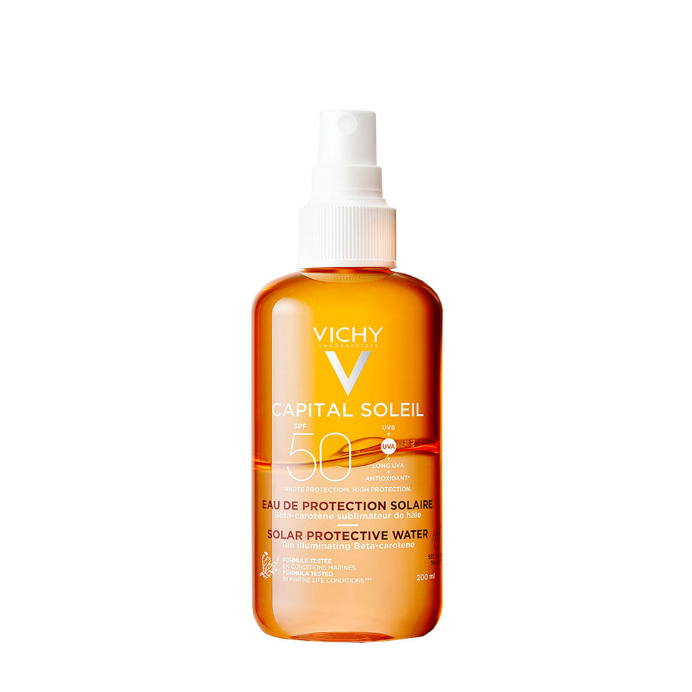Αντηλιακό Νερό Υψηλής Προστασίας από τον ήλιο για λαμπερό μαύρισμα με βήτα καροτίνη και Ιαματικό Mεταλλικό Νερό της Vichy. Ιδανικό για Πρόσωπο και Σώμα.