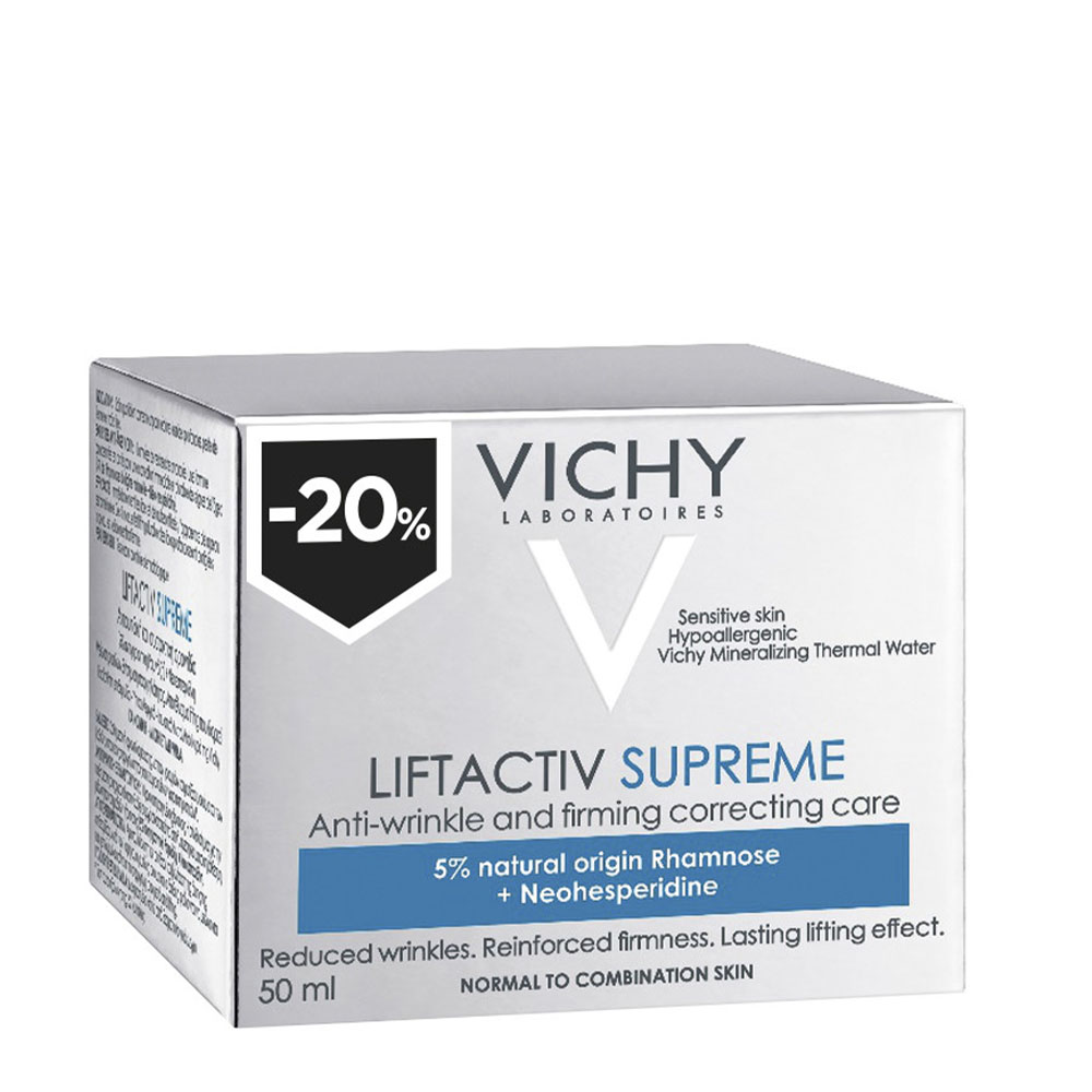 Η Liftactiv Supreme Αντιρυτιδική – Συσφικτική Κρέμα Προσώπου της Vichy για Κανονικές – Μεικτές επιδερμίδες παρέχει αποτέλεσμα λίφτινγκ με μία λεπτόρρευστη υφή και ματ αποτέλεσμα. Για 1η φορά* οι αντιρυτιδικές κρέμες LIFTACTIV Supreme για μικτή και κανονική επιδερμίδα παρέχουν συνεχές lifting για επανόρθωση των ρυτίδων και σύσφιξη σε όλη τη διάρκεια της ημέρας. Για κανονικές ή μικτές επιδερμίδες ΑΠΟΤΕΛΕΣΜΑΤΙΚΟΤΗΤΑ ΠΡΟΪΟΝΤΟΣ – Άμεσα: Επιδερμίδα λεία και λαμπερή χάρη στην ΤΕΧΝΟΛΟΓΙΑ 3D ΟΠΤΙΚΗΣ ΔΙΟΡΘΩΣΗΣ Μέχρι το τέλος της ημέρας, η επιδερμίδα παραμένει λεία, τα χαρακτηριστικά παραμένουν σφριγηλά και το πρόσωπο διατηρεί τη νεότητά του. Σε 1 μήνα, ολικό αποτέλεσμα lifting: επανόρθωση των ρυτίδων με την κρέμα αντιγήρανσης LIFTACTIV Supreme, ακόμα και των πιο έντονων, +32% σφριγηλότητα**. – Μέχρι το τέλος της ημέρας: Επιδερμίδα με περισσότερη λάμψη, +16,4% πιο σφριγηλή. Το πρόσωπο διατηρεί τη νεότητά του, χάρη στην τεχνολογία DAYPROOF με ΚΑΦΕΪΝΗ (αποσυμφoρητική δράση) και ΑΔΕΝΟΣΙΝΗ (αντιρυτιδική δράση). -1 μήνα μετά: H επιδερμίδα + 32% πιο σφριγηλή. Ακόμα και οι πιο έντονες ρυτίδες επανορθώνονται, χάρη στη σύνθεση με ΡΑΜΝΟΖΗ 5% (ισχυρή αντιγηραντική δράση) και ΝΕΟΕΣΠΕΡΙΔΙΝΗ (αντιοξειδωτική δράση) για ολικό αποτέλεσμα lifting. *Από τη Vichy. ** Τεστ προσωπικής αξιολόγησης, 52 γυναίκες, χρήση 4 εβδομάδες, 2 φορές / ημέρα, Οργανομετρική αξιολόγηση, 40 γυναίκες, Τεστ προσωπικής αξιολόγησης, 44 γυναίκες, χρήση 4 εβδομάδες, 2 φορές / ημέρα.