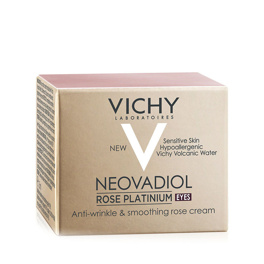 NEOVADIOL ROSE PLATINIUM EYES. Αντιγηραντική κρέμα ματιών ιδανική για την ώριμη και θαμπή επιδερμίδα. Η θρεπτική & αναζωογονητική ροζ σύνθεσή της έχει σχεδιαστεί για να μειώνει το οίδημα των βλεφάρων και να λειαίνει ορατά τις ρυτίδες στην περιοχή των ματιών. Ενισχυμένη με καφεΐνη για να καταπολεμά το οίδημα, ασβέστιο για ενδυνάμωση και Ιαματικό Ηφαιστειακό Νερό της Vichy για ενίσχυση της επιδερμίδας. Οι ρυτίδες εξασθενούν οπτικά και η περιοχή των ματιών δείχνει πιο νεανική.